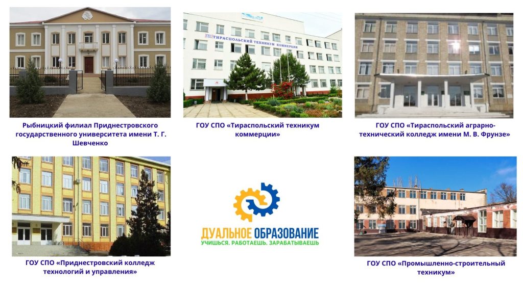 Так, в ГОУ СПО «Тираспольский аграрно-технический колледж имени М. В. Фрунзе» на первый курс поступили 22 студента по специальности «Агрономия» и 31 студент по направлению «Мехатроника в отрасли сельского хозяйства». В ГОУ СПО «Тираспольский техникум коммерции» обучение по дуальной программе начинают 18 студентов по профессии «Повар». В ГОУ СПО «Приднестровский колледж технологий и управления» направление «Мехатроника» выбрали также 18 первокурсников. В ГОУ СПО «Промышленно-строительный техникум» 23 студента приступили к освоению специальности «Электромонтер по ремонту и обслуживанию электрооборудования». В Рыбницком филиале Приднестровского государственного университета имени Т. Г. Шевченко 15 студентов начали обучение по профессии «Техник по комплексному обслуживанию автоматизированных систем объектов ЖКХ».