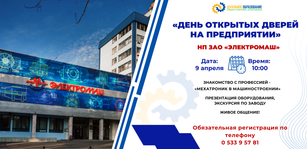 НП ЗАО «Электромаш» — 09 апреля 2026 г. с10.00 Специальность: «Мехатроник в машиностроении». Вместимость мероприятия — не более 80 учащихся 9-х классов.