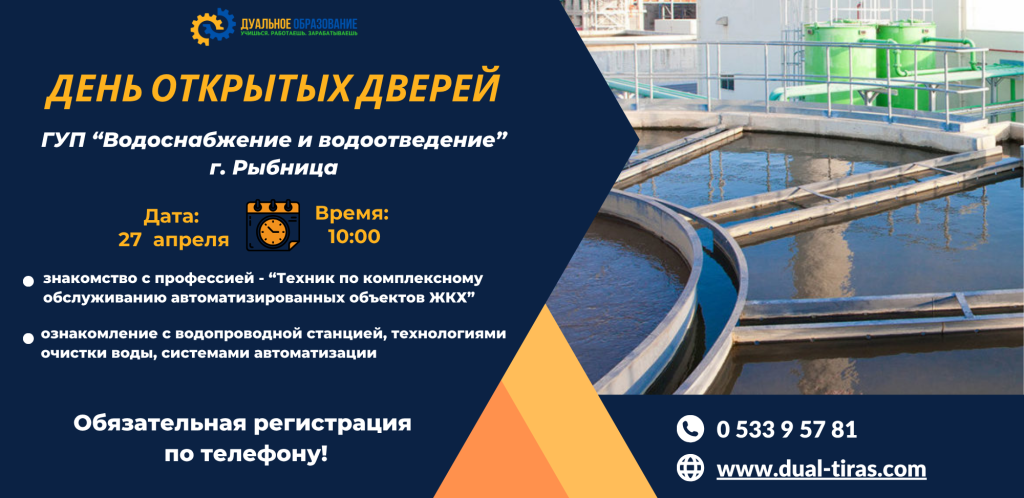 ГУП «Водоснабжение и водоотведение, г. Рыбница — 27 апреля 2026 год с 10.00. Специальность: «Техник по комплексному обслуживанию автоматизированных систем объектов ЖКХ» Вместимость мероприятия — не более 80 учащихся 9-х классов.