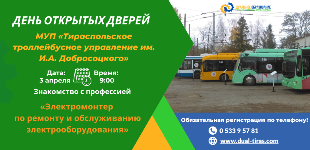 МУП «Тираспольское троллейбусное управление им И.А. Добросоцкого» — 03 апреля 2026 г. с 9.00. Специальность: «Электромонтер по ремонту и обслуживанию электрооборудования»